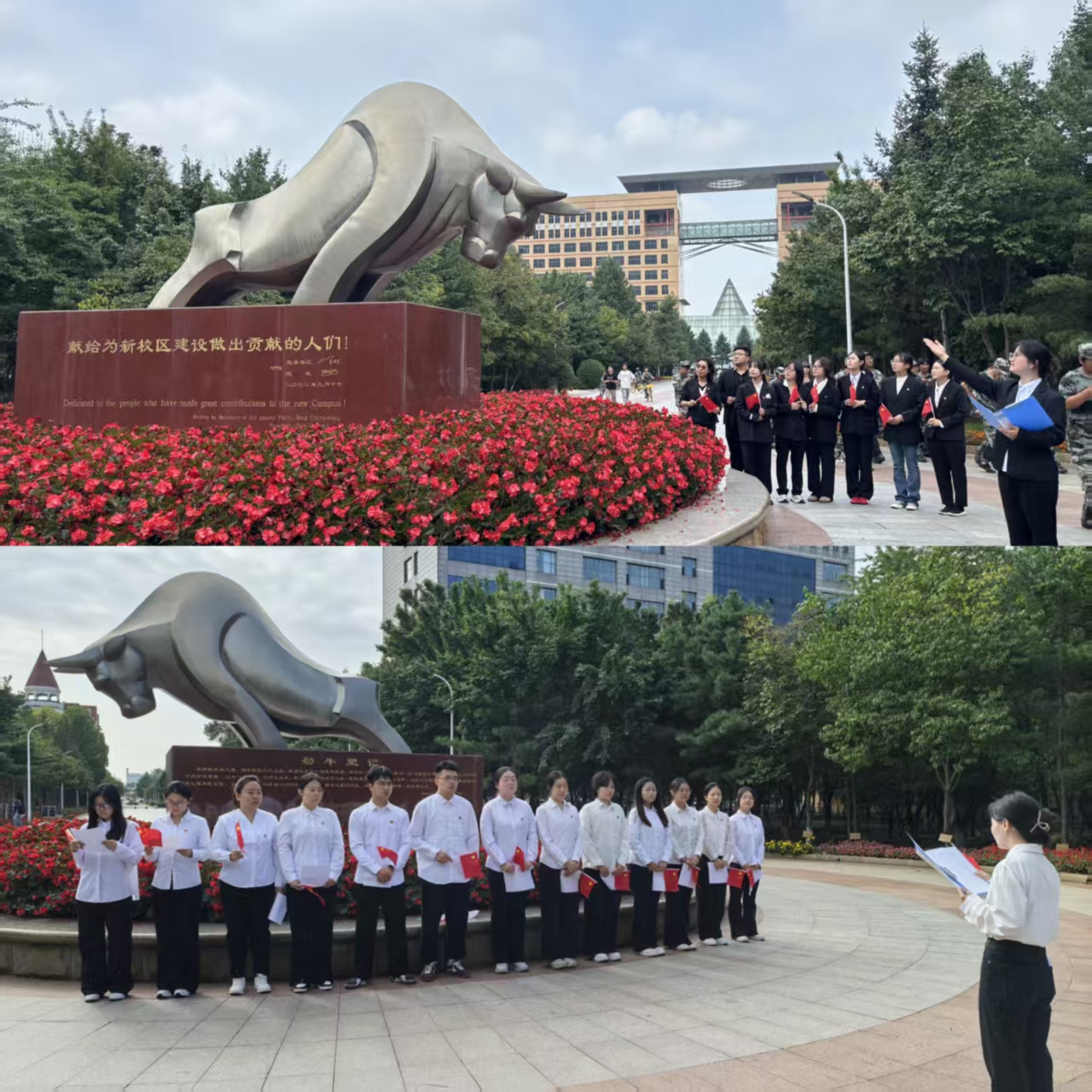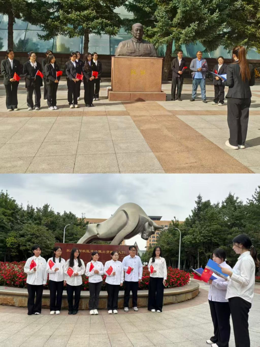 按照公司党委下发的主题党日活动方案,在各党支部书记的带领下,党员们佩戴党员徽章,挥舞着小红旗,整齐划一、依次参观陈郁塑像、劲牛雕塑、太阳石广场。每到一处都驻足凝神,在沉浸式学习中深刻体悟“科大精神”的丰富内涵,从校史脉络与精神内核中汲取奋进力量。集体合唱校歌《江畔朝阳》,表达着对公司这片沃土的深情厚爱,寄托着对公司未来蓬勃发展的美好期许。