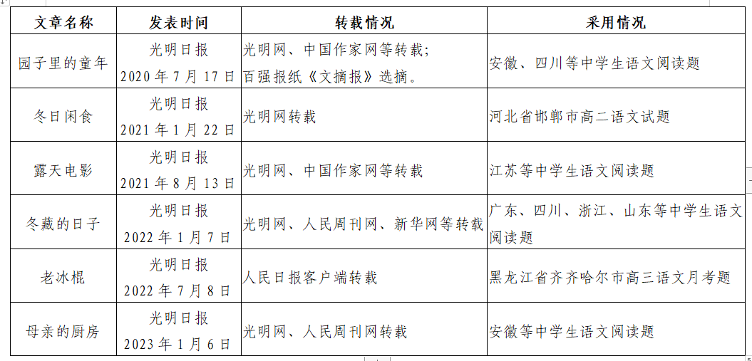 据悉,李秀萍老师自2020年以来,先后在《光明日报》发表“园子里的童年”“冬日闲食”“露天电影”“冬藏的日子”“老冰棍”“母亲的厨房”“母亲的园子”等文章,被各大媒体广泛转载,被部分省份纳入语文学科考试内容。