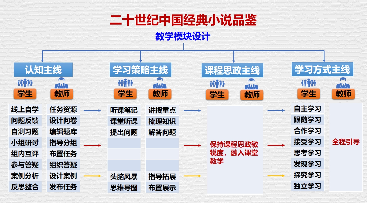 《二十世纪中国经典小说品鉴》课程采用“四大主线”课程模块设计,以认知为牵引,细化教学策略,深入挖掘课程思政元素,坚持OBE教学理念的创新施用。