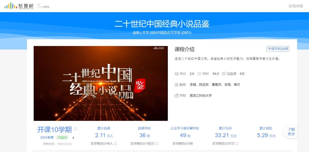 2019年教学内容全新改版、教学设计全面升级,更名为《二十世纪中国经典小说品鉴》的课程,在智慧树平台上线。授课视频91个,最初上线授课时长658分钟,2021年更新为现在的661分钟。2023年该门课程获批第三批黑龙江省一流本科课程。