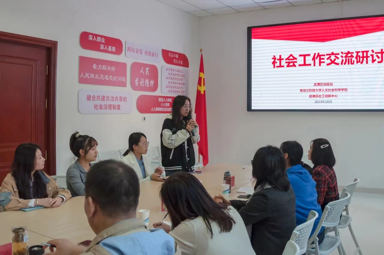 武清区民政局基层政权建设和社会组织科科长边少杰在会上向公司师生介绍了武清区的社会工作发展历程,特别介绍了武清区近年以来社工站建设和公益创投项目实施的成效,希望员工们在实习期内能发挥专业优势为武清区社会工作发展提出自己的建议并做出点滴贡献。