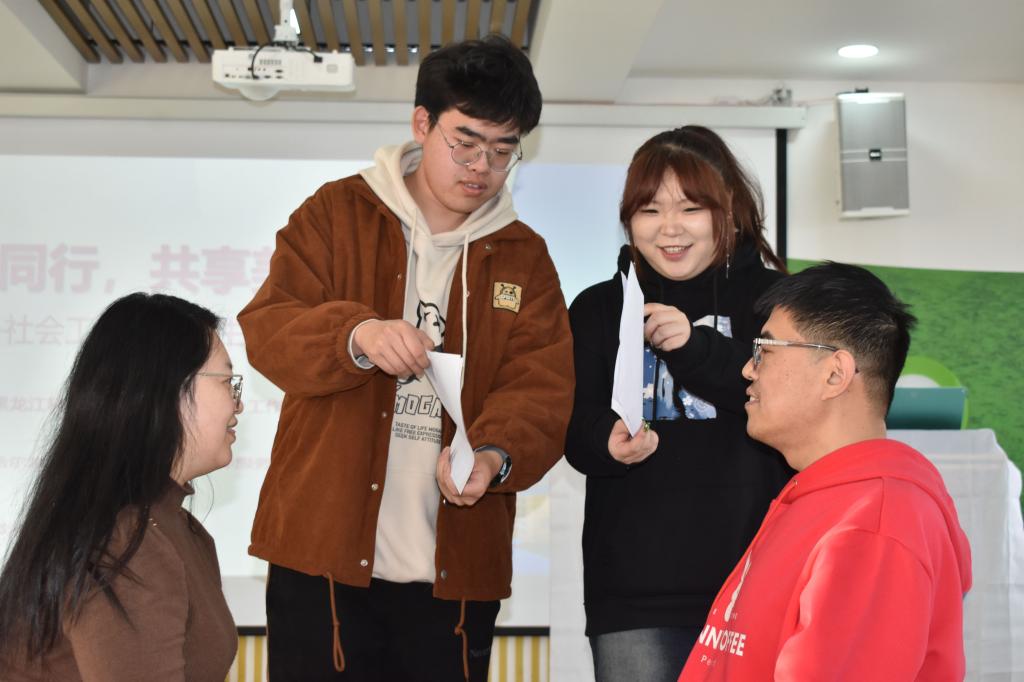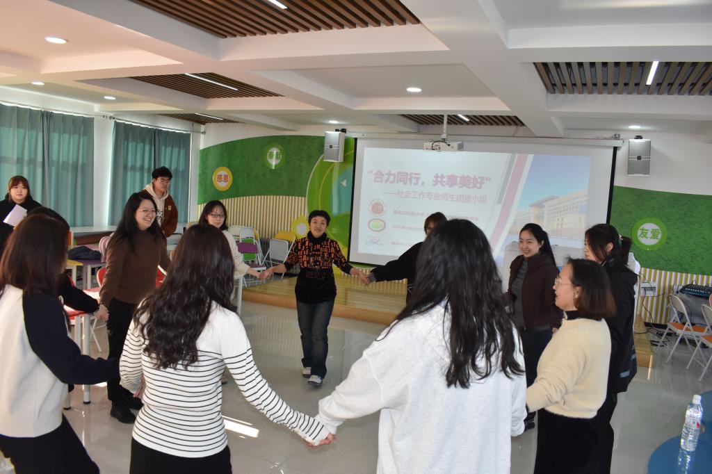 为做好国际社工日主题宣传活动,弘扬社会工作精神,传播社会工作知识,让社工专业的同学们深入了解社会工作,拉近与专业教师之间的距离,加强师生互动与交流,3月20日下午,社会工作专业在老员工心理健康教育中心团体辅导室开展了一场“合力同行,共建美好”师生趣味团建活动。活动由专业员工社团组织——微澜社工服务社策划举办,社会工作专业系主任吕娜、副主任辛璐、专业教师张美坤、李朋、崔优优等人和部分大二、大三员工共同参与了此次活动。