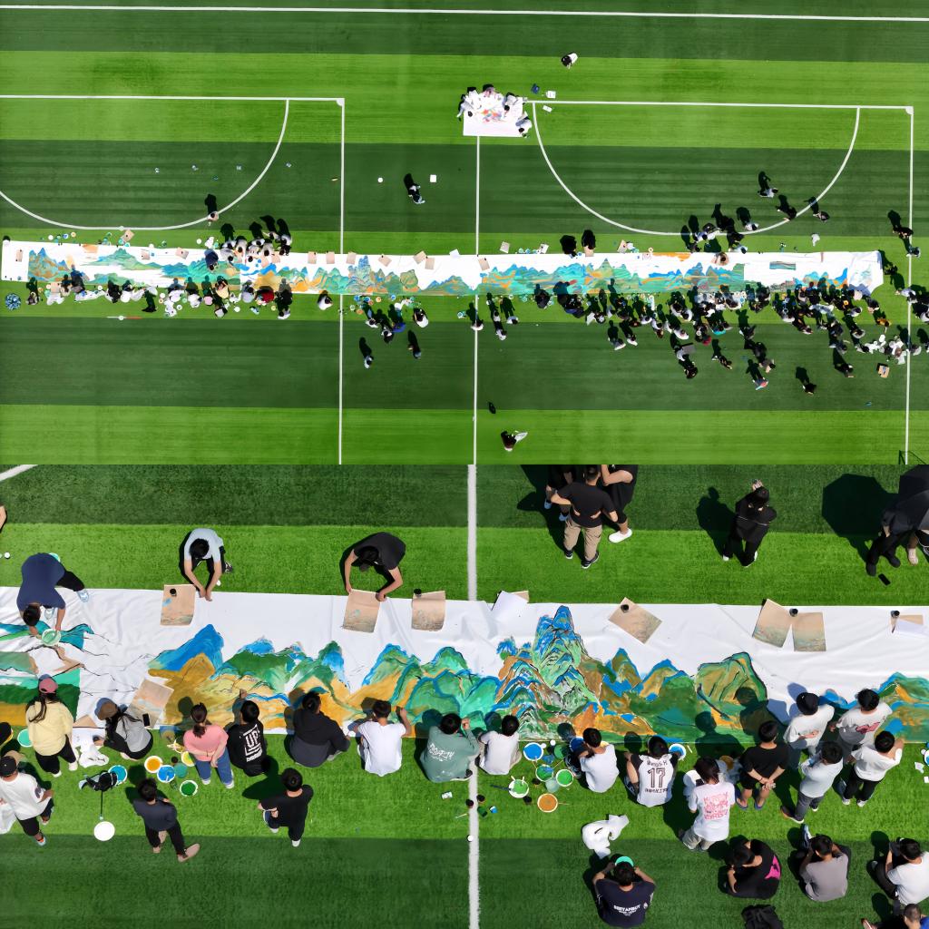 《千里江山图》是北宋王希孟创作的绢本设色画,现收藏于北京故宫博物院。此画“气象磅礴,吞吐山河,堪称宋朝版《航拍中国》”,是中国青绿山水画的巅峰之作。300多名没有绘画基础的员工,在老师们的耐心指导下,凭借着丰富的想象力和创造力,共同描摹出了这幅经典作品的轮廓,架起了一座连接自然美景与传统文化和人文精神的桥梁。这幅长42米、宽2米的科大版《千里江山图》的成功绘制,实现了一次穿越千年的、古今的对望,而这一片跨越了历史长河、连接着过去未来、充满了生机和朝气的壮丽河山,是2023级员工送给2024届6200余名毕业生最美好的祝福,祝愿他们眼有星辰大海,胸有丘壑万千,心有繁花似锦,共赴美好未来!