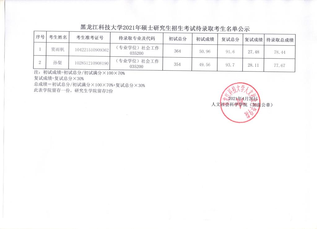 2021年硕士研究生招生考试待录取考生名单公示(第三次调剂)