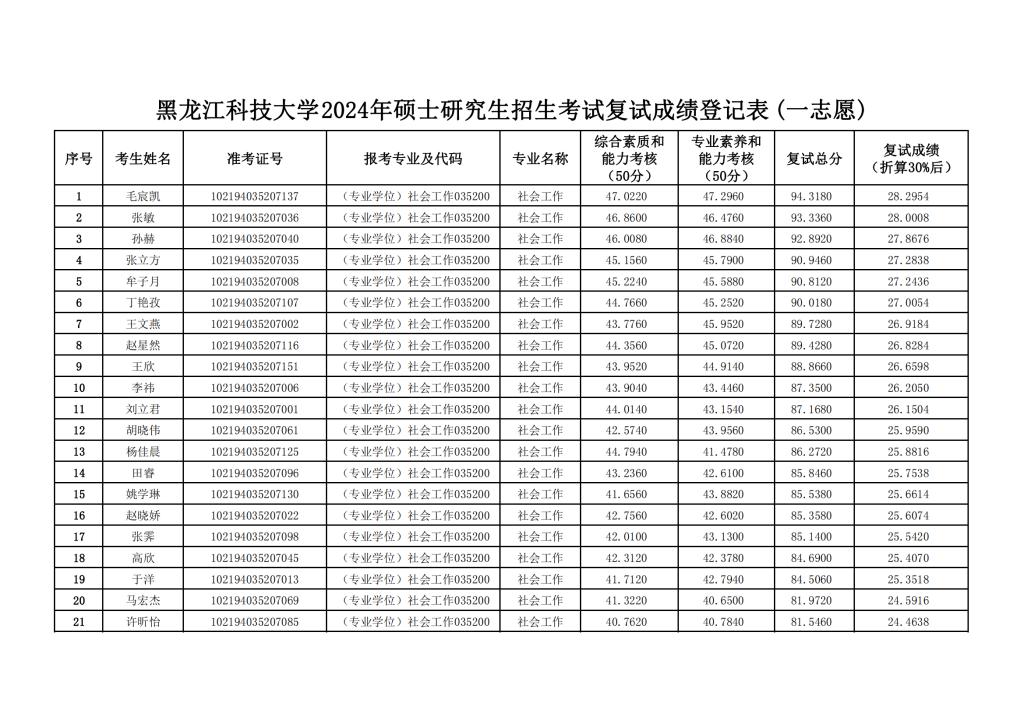 【公示】2024年社会工作硕士研究生招生考试复试成绩公示(一志愿)