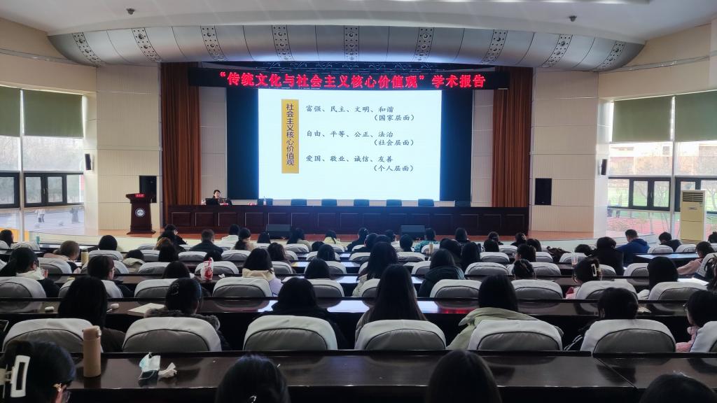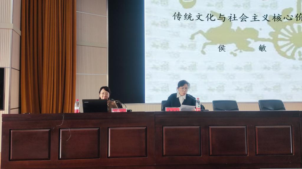 侯敏教授以《传统文化与社会主义核心价值观》为题,用社会主义核心价值观的12个词24字作为报告的总脉络,从国家层面、社会层面和个人层面三个维度,通过援引中国古代文学经史典籍,分别对24个字的历史渊源,文化背景、思想内涵进行了深刻阐述和价值挖掘。