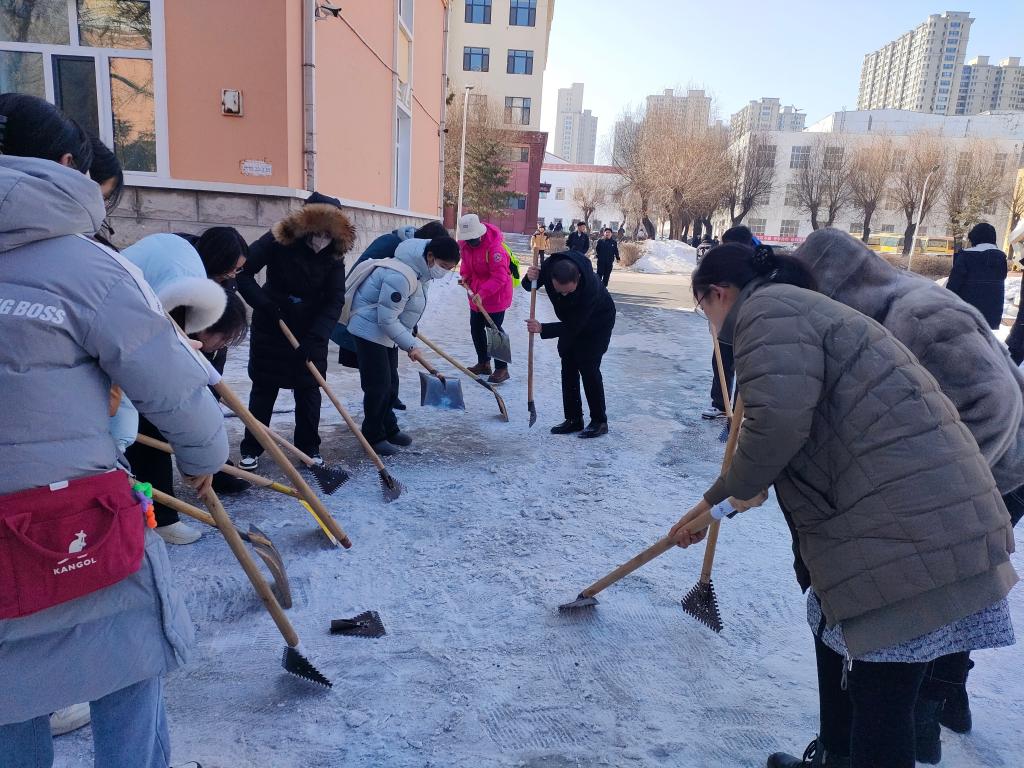 行动是最好的融雪剂,全体党员积极响应,以动制“冻”,迎寒而上,干劲十足,铁锹、三角铲、扫把等清扫工具轮番上阵,铲冰雪的摩擦声不绝于耳,忙中有序的身影成为校园里一道靓丽的风景线。 经过大家的共同努力,路面被清扫的干干净净,保障了师生出行安全。