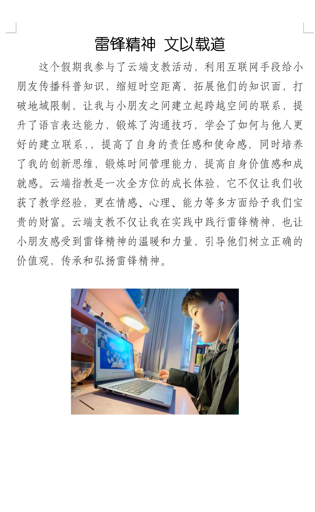 开展“文脉相承 雷锋精神”文字征集活动。同学们通过温暖的文字记录下起早贪黑保障伙食的食堂阿姨、日夜不息守护我们的保安大叔以及乐于助人的身边同学,每一次善意帮扶、每一份无私奉献、每一天温暖传递,都被同学们用笔记录温暖瞬间、定格点滴善意。本次活动不仅让雷锋精神具象化,更加促使同学们以全新视角审视身边的人和事,发现日常中被忽视的温暖细节,让“雷锋精神”不再是遥不可及的概念,而是真切融入校园生活的点点滴滴,在校园里凝聚起一股向上向善的力量,激励着更多同学的善意化为行动。
