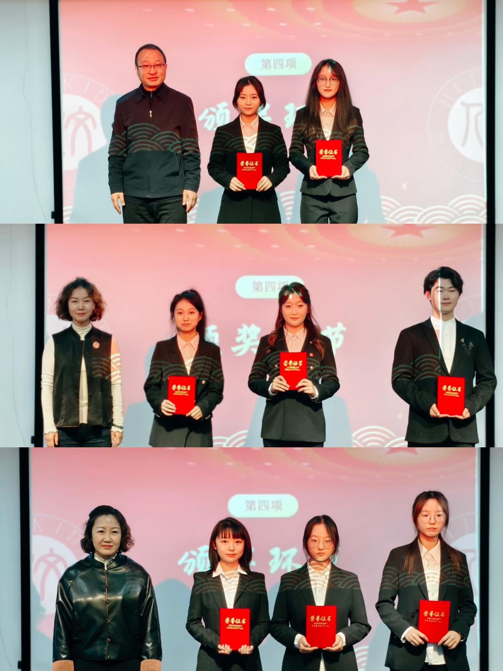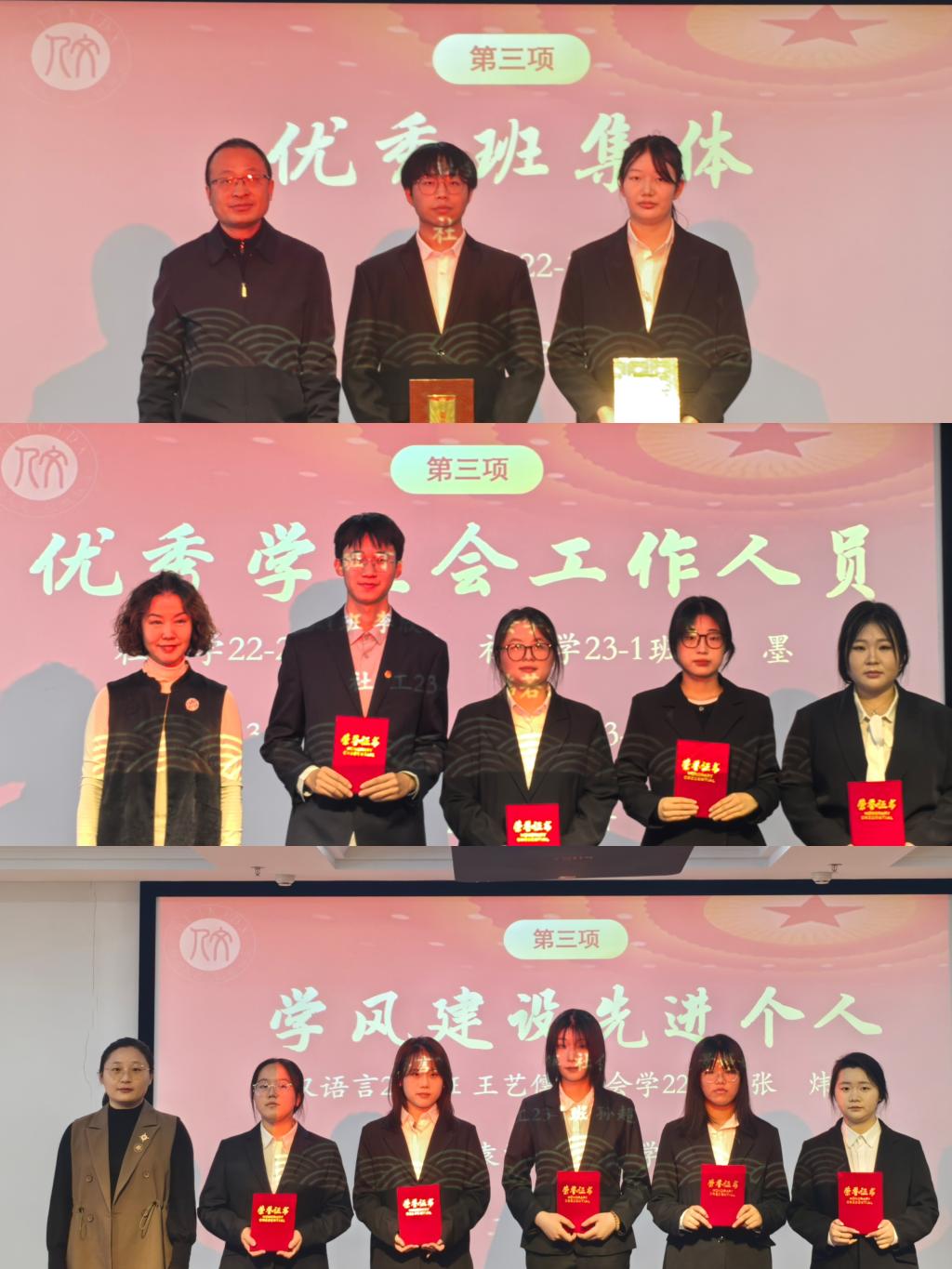 大会在庄严的国歌声中拉开帷幕。团委书记韩雪宣读了《关于表彰2024年度“优秀班集体”“优秀员工会工作人员”“学风建设先进个人”“校园文化建设先进个人”的决定》,与会领导和老师分别为受表彰的班集体和优秀个人颁发荣誉证书,先进个人代表汉语言21-2班王艺儒、社会学23-2班卢逸飞作典型经验交流。