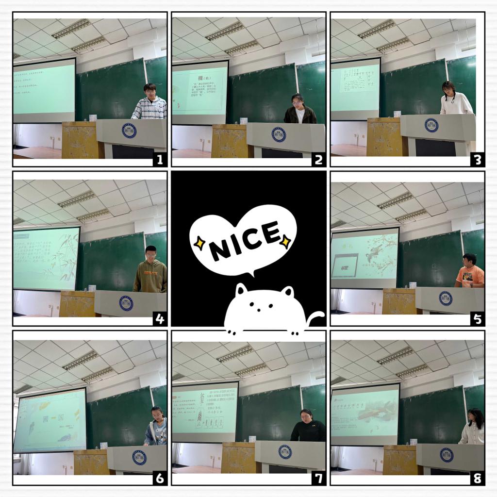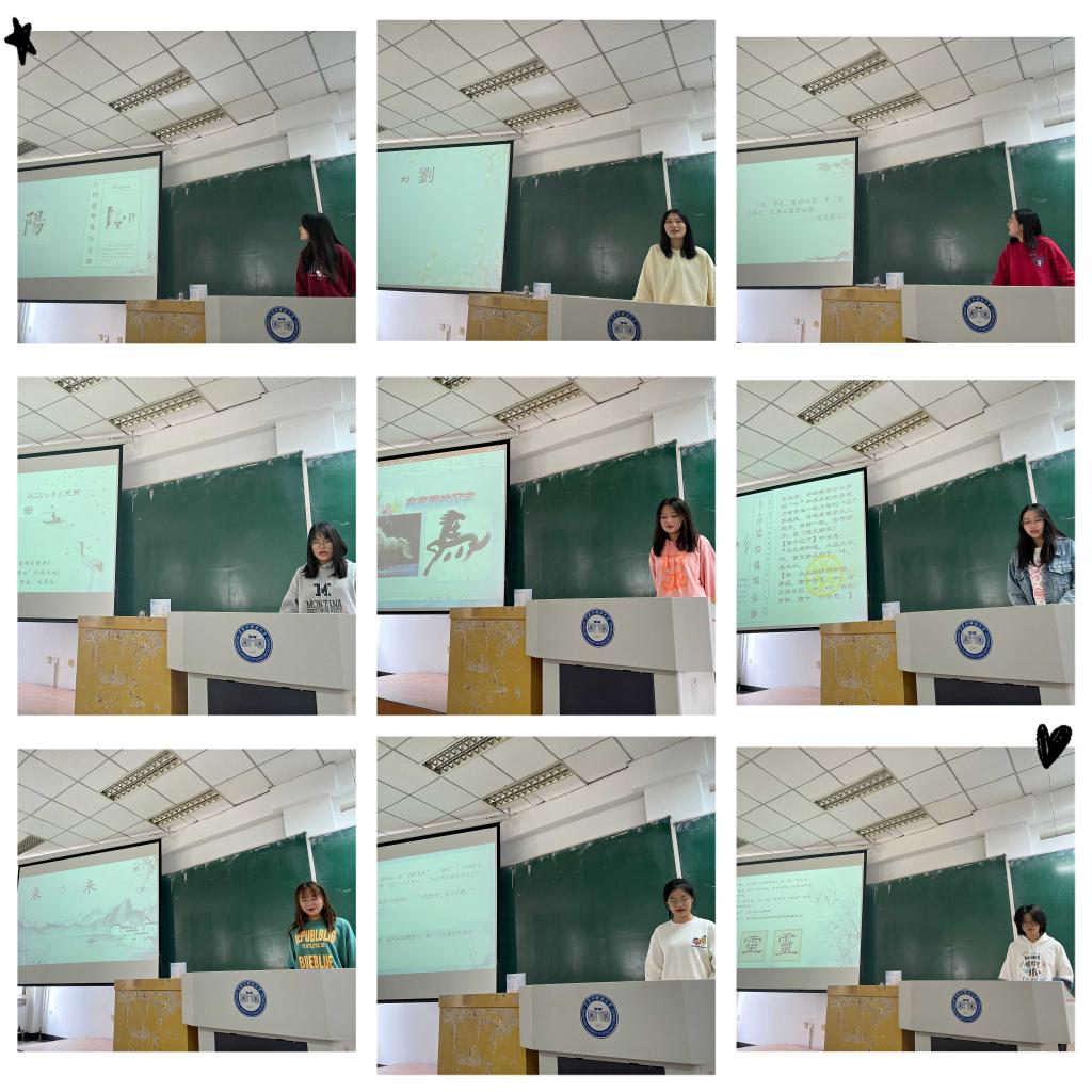 本次活动主要以演讲分享的方式展开,同学们选取自己感兴趣的汉字,以PPT为载体,分别从造字法、字形字义演变、文化思想等方面进行讲解。同学们或是选择自己姓氏或名字中的某个字,如“刘”“周”“义”;或是选择与自己生活密切相关的字,如教师的“教”、节日的“节”;或是选择文化意义深厚的“书”“画”“玺”“礼”“喜”等字。大家从汉字演变过程出发,说文解字,使汉字活起来;以汉字实义结尾,本义引申,使汉字静下来。“有思想的汉字”让课堂上不时爆发出欢快的笑声和恍然大悟的惊呼。高方教授则见缝插针,对个别分享内容进行更正或是进一步补充说明,丰富了同学们对汉字语义、语用和意蕴的认识。