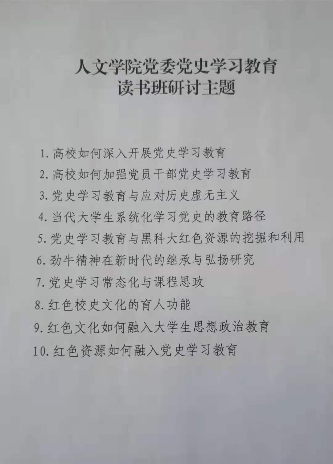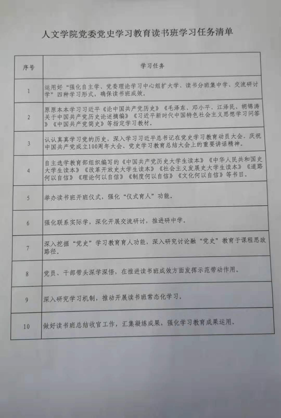“清单化”落细学习任务。围绕读书班“为何学、学什么、怎么学”,人文党委制定了《党史学习教育读书班实施方案》《党史学习教育读书班学习任务清单》《党史学习教育读书班研讨主题》,确保读书班活动集中研讨好、分享交流好、示范引领好。