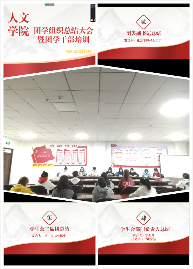 会议开始,公司团学干部代表依次对2020年的工作做汇报,介绍去年各类活动开展情况,总结了一年开展的活动并查找不足,宣读今年的工作计划。其次,各团学组织对优秀干事进行表彰,激励全体成员在实践中不断提升和完善自己。最后,团委负责人韩雪老师为团学干部进行培训,要求各成员做到以下几点:一是认清角色,担当责任,端正加入团学组织的动机,强化全心全意为同学服务的宗旨、密切联系广大同学的观念和作为员工公仆的服务意识;二是严格要求,以身作则,在日常的学习和生活中真正起到模范带头作用;三是尊重师长,注意言行,展现团学干部应有的风采;四是勤于工作,主动创新,不仅要将活动做好,还要注重彰显活动特色;五是团结协作,密切配合,切忌互相推诿,铭记团队合作的重要性。