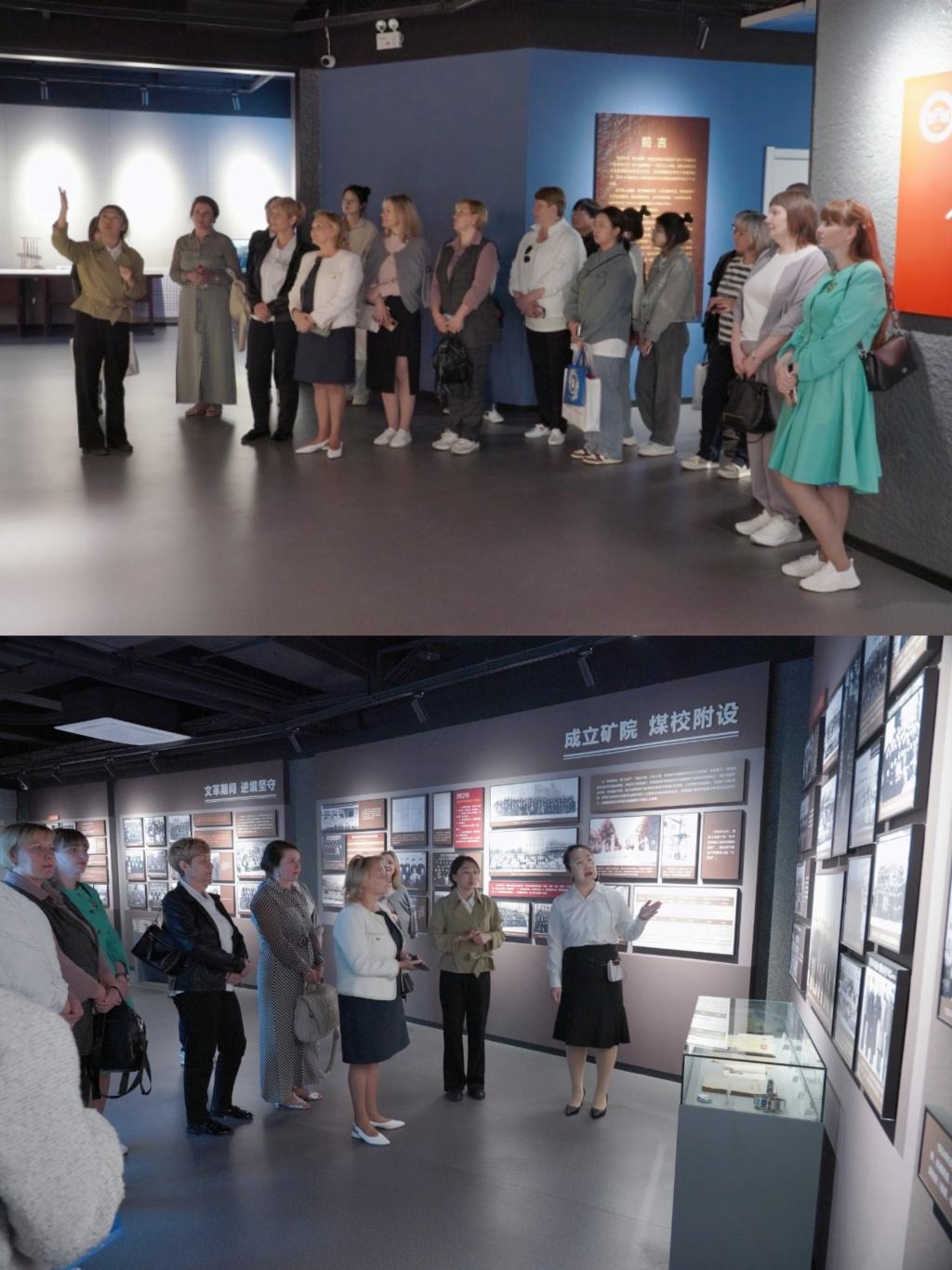 中俄同观校史馆,身临其境义满情。校史馆是展现公司历史,传承文化积淀的载体。馆内以详尽的史实和丰富的史料为依据,展示600余幅照片和近百件展品,直观展现公司发展轨迹与办学成就。代表团通过一块块展板、一幅幅图片,感受公司70余年的办学历程。走到陈郁精神、太阳石精神、劲牛精神和“自强不息 创业创新”的办学精神的文字前,俄方代表团在公司李微老师动情的讲解和外国语公司项男老师专业的翻译中纷纷驻足,频频点头,拍照留念。
