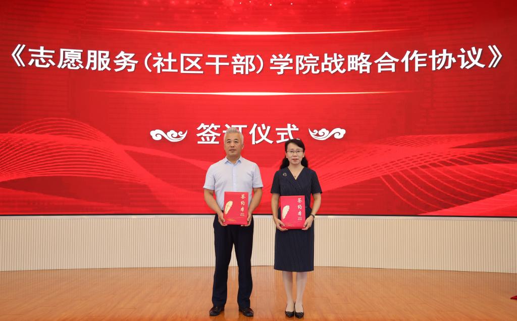 松北区委社会工作部部长鲍士杰与教务处处长宋志伟共同签订了 “志愿服务(社区干部)公司战略合作协议”,旨在志愿精神的传播、社区服务能力的提升以及政校合作中搭建新的平台。