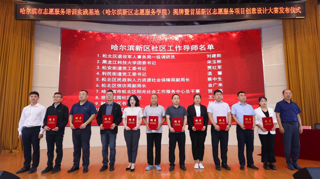 钟波与校纪委书记(监察专员)王延高为新区志愿服务(社区干部)公司聘请的“哈尔滨新区志愿服务导师”和“哈尔滨新区社区工作导师”代表颁发了聘书。