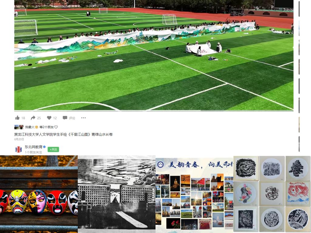 秉持以美育人、以文化人、以美培元理念,构建特色的美育工作体系,创作出系列弘扬科大精神、彰显科大气派的美育作品。其中,“《千里江山图》青绿山水长卷绘画暨《我的公司》思维导图绘制活动”,被东北网教育视频号发布推广。