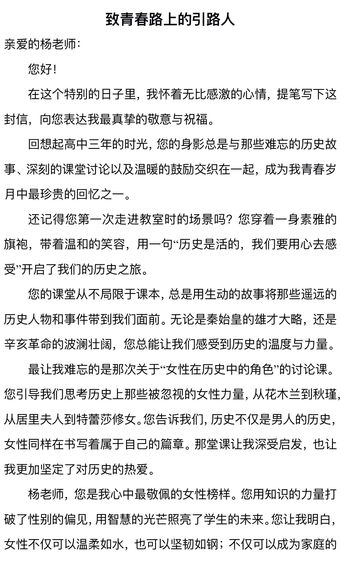开展“笑颜如花 寄语芳华”三八女神节书信活动。同学们以纸为舟,以笔为桨,将对母亲的温柔、对师长的敬仰、对朋友的情谊,以及对所有女性美好品质的赞美,巧妙融入一封封独具匠心的书信之中。每一字、每一句,都凝聚着同学们的真挚情感与细腻观察,仿佛一幅幅生动的画卷,展现了女性独有的魅力与风采。