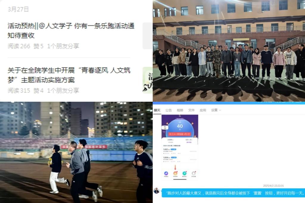 活动前期,公司团委精心制定了“青春逐风 人文筑梦”主题校园乐跑活动实施方案,教育引导同学们积极参加校园阳光跑活动,走出宿舍、走下网络、走向操场。活动启动,同学们积极响应、自愿报名,运动场上每周准时出现一群亮丽的身影,师生身着运动服快乐集结、逐梦出发,一起见证星光下的奔跑与欢笑,享受心跳加速的活力。乐跑不设门槛,注重健康与安全,包括合影留念、诚信打卡、自我监督、励志语录等内容。师生们在跑步中分享运动小技巧,交流学习生活,既增强了体质、照亮了彼此,又拉近了距离、增进了友谊,达到了释放压力、调解情绪、重塑自信的目的,已然成为了校园里一道亮丽的风景线。