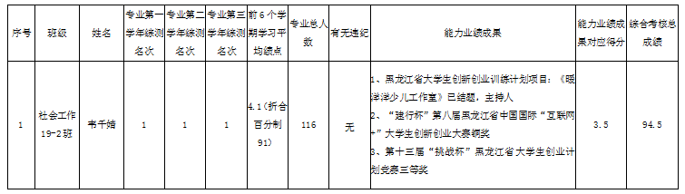 经公司面向全体2019级员工下发《乐天使推荐优秀应届本科毕业生免试攻读硕士研究生工作实施细则(试行)》通知,经个人申报、公司审查、员工答辩,推免工作小组依据研究生推免能力业绩成果考核指标表打分。经推免工作小组讨论研究决定,拟确定社会工作19-2班韦千婧作为公司2023年优秀应届本科毕业生免试攻读硕士人选,现面向公司全体师生予以公示。