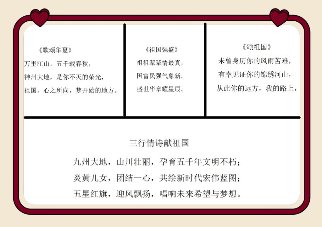 三行情深,诗颂祖国。三行情诗,说不尽对祖国的千言万语,道不完对祖国的美好祝福,唯有以理想作桨,以信念作帆,挺膺青春之姿,追逐时代华章。