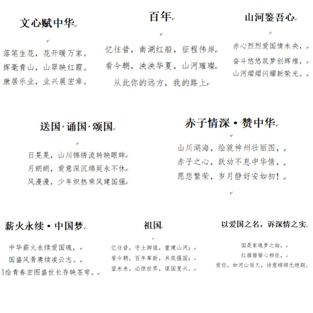笔墨书丹心,情深赞祖国。同学们以诗为媒,把对祖国的热爱化作一行行优美的诗句;以情为线,将对祖国的祝福编织成一首首感人的诗篇。寥寥数语,勾勒出一幅幅生动的爱国画面;短短三行,倾诉着对祖国的无限深情,每一个字都饱含深情,每一句话都传递着对祖国的无限忠诚。