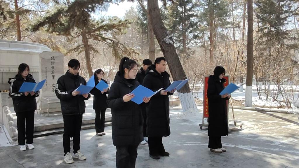 活动伊始,全体同学肃立于东北抗联第一路军三方面军陈瀚章将军陵墓前齐唱国歌,重温入团誓词,用洪亮且坚定的誓言彰显新时代青年传承先烈精神、矢志不渝的信念与担当;随后,员工分会体育部负责人李欣蕊深情讲述陈瀚章将军的英勇事迹,他以血肉之躯筑起抗日长城,用生命践行“丹心卫中华”的赤诚誓言,令在场的同学们无不动容;接着,9名同学带来诗歌朗诵《英雄的丰碑》,他们用激昂豪迈的语调回溯革命先辈们浴血奋战的峥嵘岁月。一句句铿锵有力的诗句,如同一记记重锤,叩击着每一位同学的心灵,传递出对先烈们无比崇高的敬意与深切缅怀。在肃穆的氛围中,全体同学低头肃立默哀。同学们用无声的追思,向为国家独立和民族解放事业英勇献身的英烈们致以最深切的怀念。
