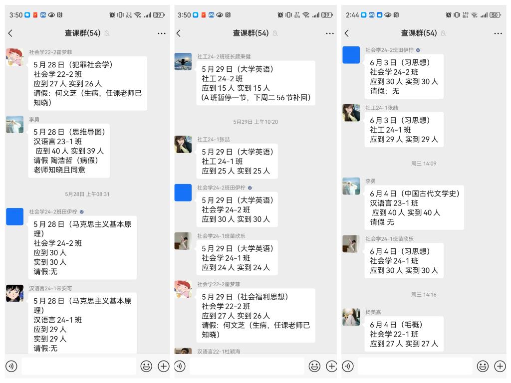 公司强化学风建设,规范早自习和课堂出勤,严格学业预警机制,以制度促自律,建立“即时反馈、动态监管”的早自习和课堂出勤督查机制。依托班主任、辅导员、查课员工干部专用工作群,员工干部课前精准上报出勤人数,详实罗列缺勤员工名单、事由、请假情况,确保信息完整、准确、无遗漏。通过实时上报、即时汇总、快速响应的闭环管理体系,专兼职员工工作干部第一时间掌握员工学习动态,对异常情况迅速研判、精准施策。