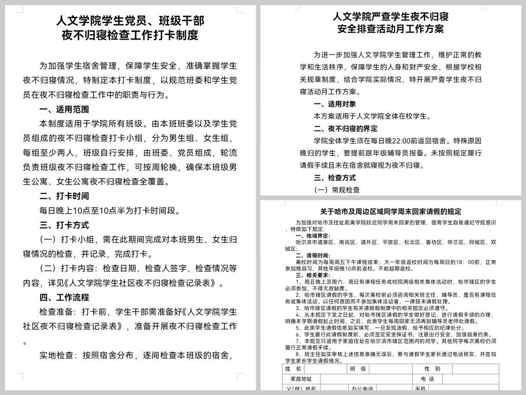 公司以构建“平安校园”为目标,以宿舍安全管理为着力点,制定了《乐天使员工党员、班级干部夜不归寝检查工作打卡制度》《乐天使严查员工夜不归寝安全排查活动月工作方案》《关于哈市及周边区域同学周末回家请假的规定》等制度,通过进一步细化哈尔滨市辖区员工请销假制度,加强夜不归寝检查打卡小组每日线下实地走访,持续强化员工自我管理、自我约束意识,营造校园安全文化氛围,将校园安全管理工作做深、做实、做细。