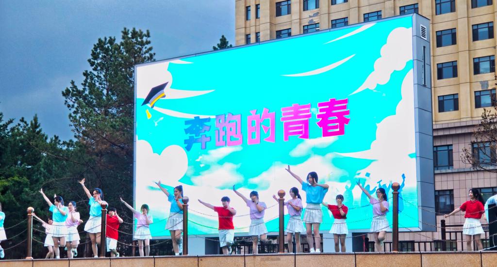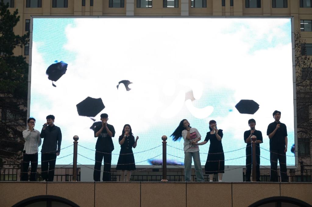 第三篇章“征途向新•梦想启航”以合唱《世界赠予我的》开篇。表演者以温润绵长的声线,层层递进地铺展三重情感画卷,抒发对母校培育之恩、师生情谊以及未来征程的诚挚礼赞。歌声中,既有对昔日的彷徨与不舍及临别之际的惆怅思绪,更包含对未来的坚定信念与热切憧憬;晚会尾声,毕业生辅导员与毕业生代表联袂献唱经典曲目《再见》,将整场晚会的氛围推向最高潮。当熟悉的旋律响起,台下观众自发进行合唱,每一个音符都震颤着青春记忆的共鸣。辅导员们以温润声线传递临别叮嘱,音符间饱含“前程似锦”的殷切期许;毕业生们则用歌声勾勒大学时光的剪影,千言万语化作哽咽的旋律。这一刻,舞台上下情感交融,泪水与笑容相应,此刻被永远定格在2025年夏夜的毕业纪念册中。